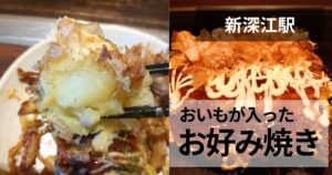 新深江駅から徒歩2分。じゃがいもと天ぷらが入ったお好み焼きです。食べ応えがあるし、味もおいしいですよ。大学時代に鶴橋まで自転車でに行った帰りによく食べてました。