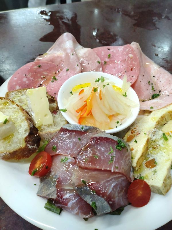 季節の魚のカルパッチョ、キッシュ、ハム、バケットとチーズ、マリネといった構成です。ほとんどの客が頼むメニューです。